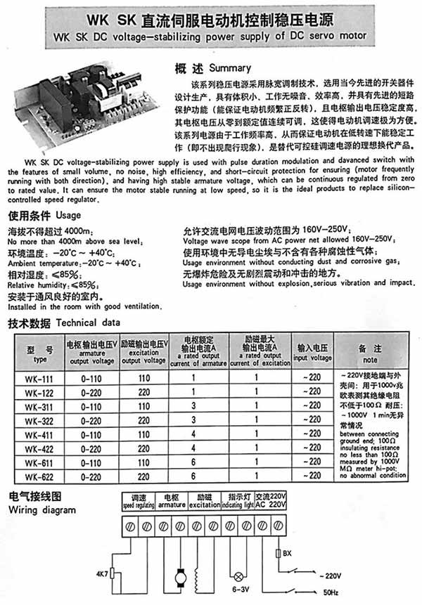 WK、SK系列直流電機穩壓電源采用脈寬調制技術,選用當今先進的開關器件設計生產,具有體積小、工作無噪音、效率高,并具有先進的短路